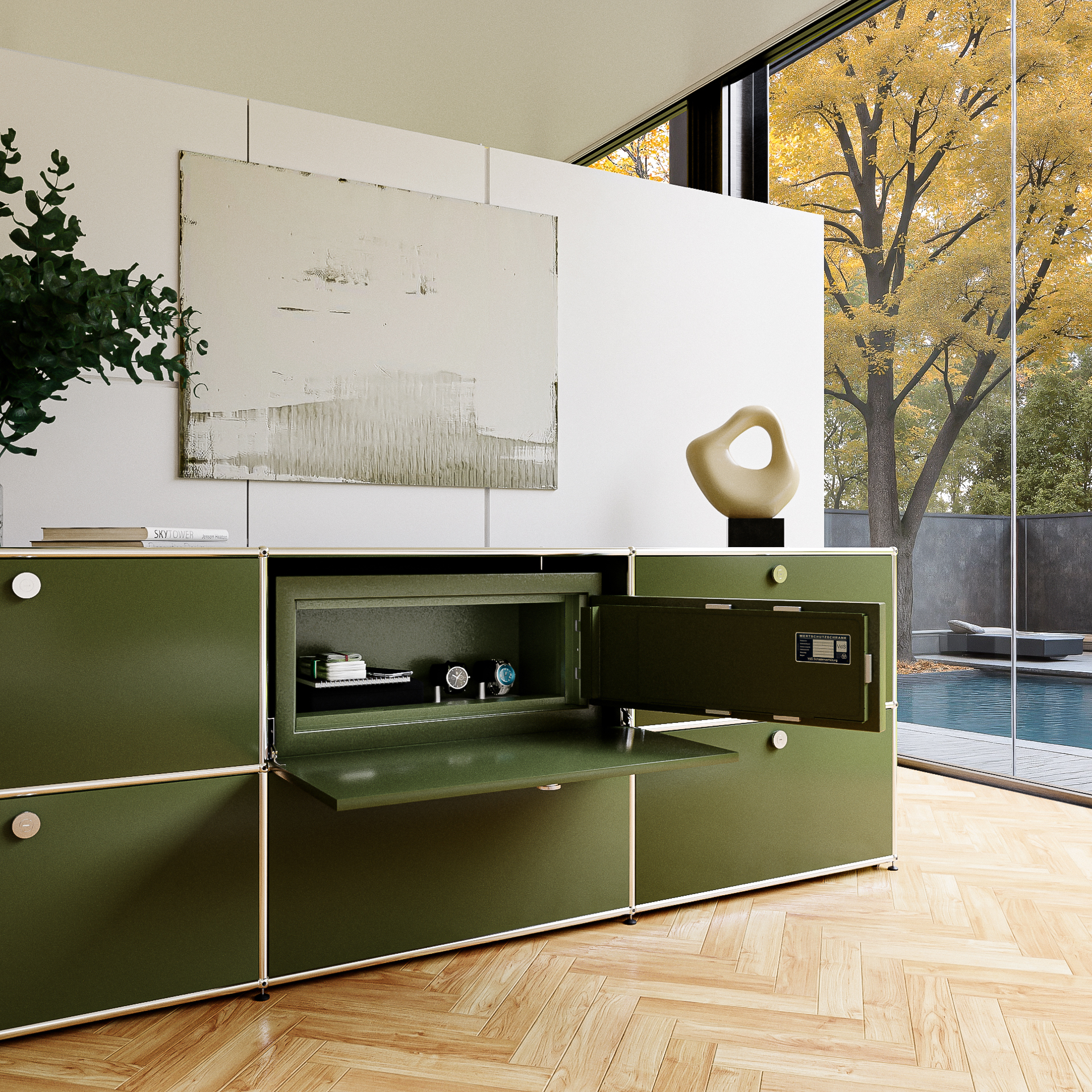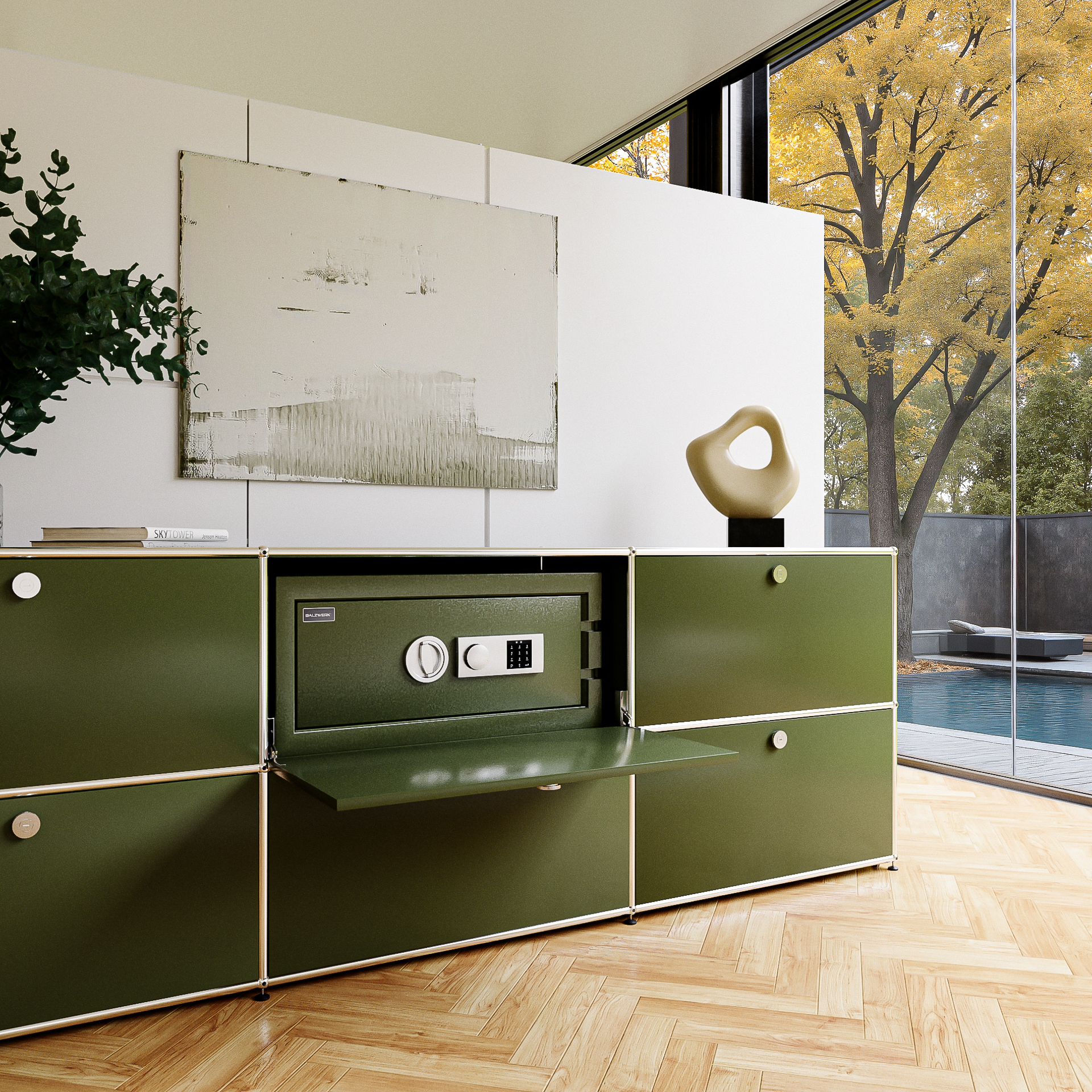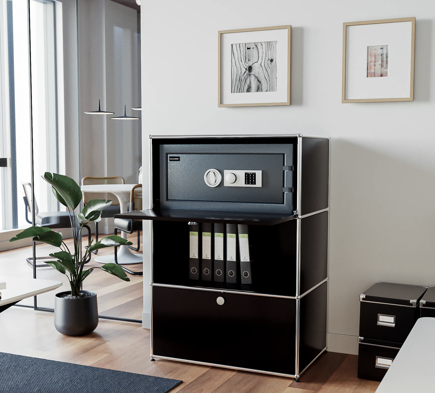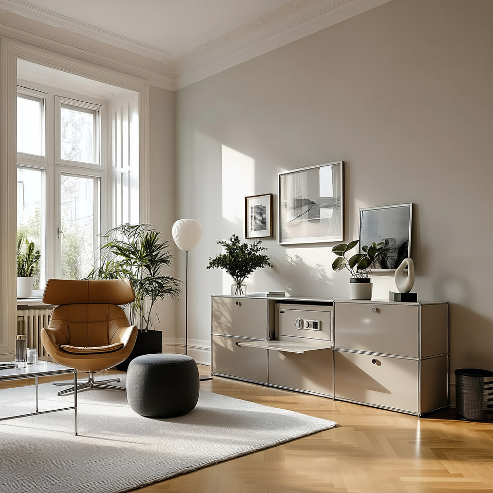 • Der Tresor liegt gleichmäßig auf dem Systemmöbel-Tablar auf, ohne punktuelle Belastung, wodurch strukturelle Probleme vermieden werden. Bei Bedarf können Stützprofile des Herstellers zur zusätzlichen Stabilisierung verwendet werden.