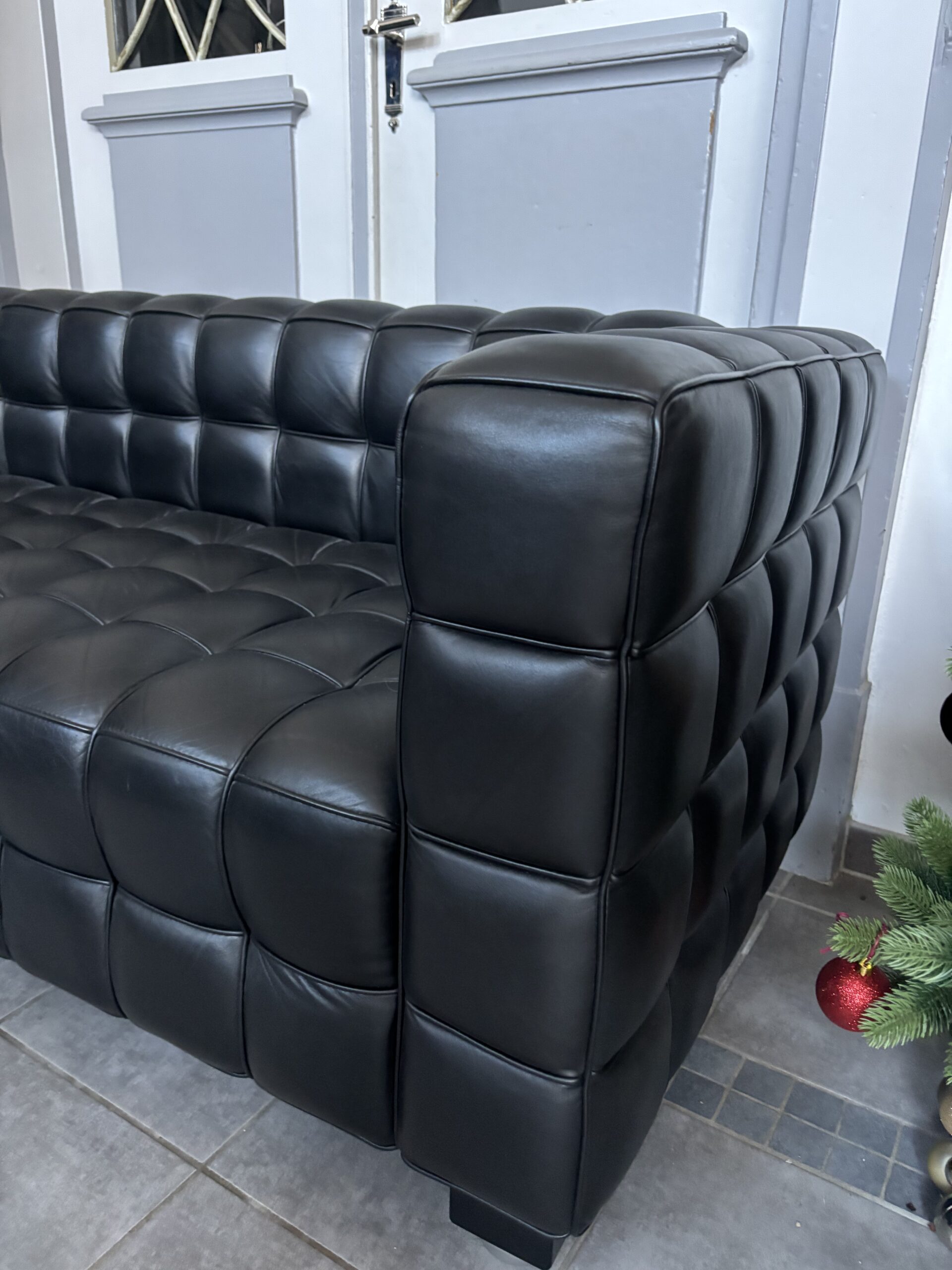 Wir bieten hier das original Wittmann Kubus Sofa in schwarzem Leder, designed von Josef Hoffmann, mit Echtheitszertifikat zum Verkauf an. Das Sofa ist in einem sehr guten gebrauchten Zustand und insgesamt zweimal vorhanden. Der Preis bezieht sich auf EIN Sofa.
