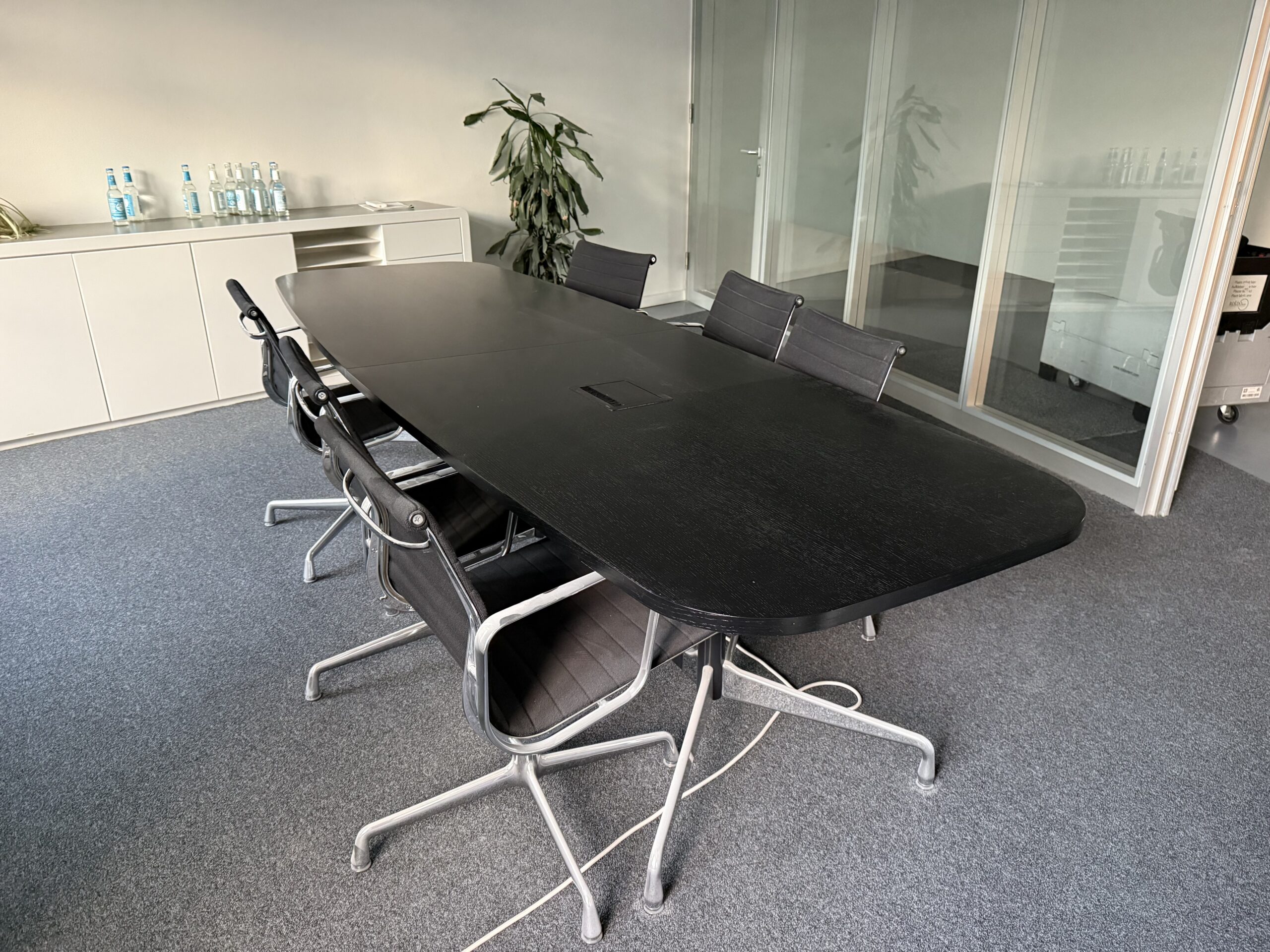 Wir bieten hier einen wunderschönen Konferenztisch mit Vitra Gestell zum Verkauf an. Um den Tisch passen bis zu 10 Vitra Alu Chairs EA 108. Diese haben wir ebenfalls vorrätig auf Lager. Auch in Leder, falls gewünscht.
